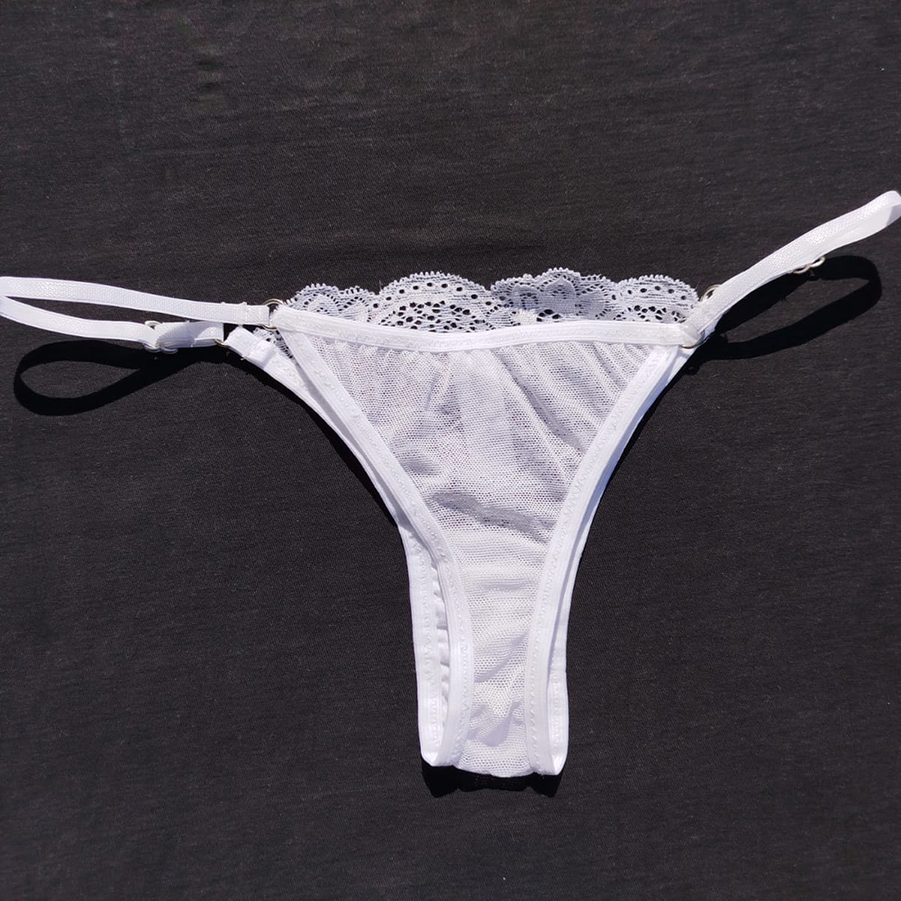 Bombacha tipo tangaless de puntilla en la parte delantera, con algodón en el refuerzo y microtul en la parte de la espalda. Posee breteles regulables para mejor ajuste.