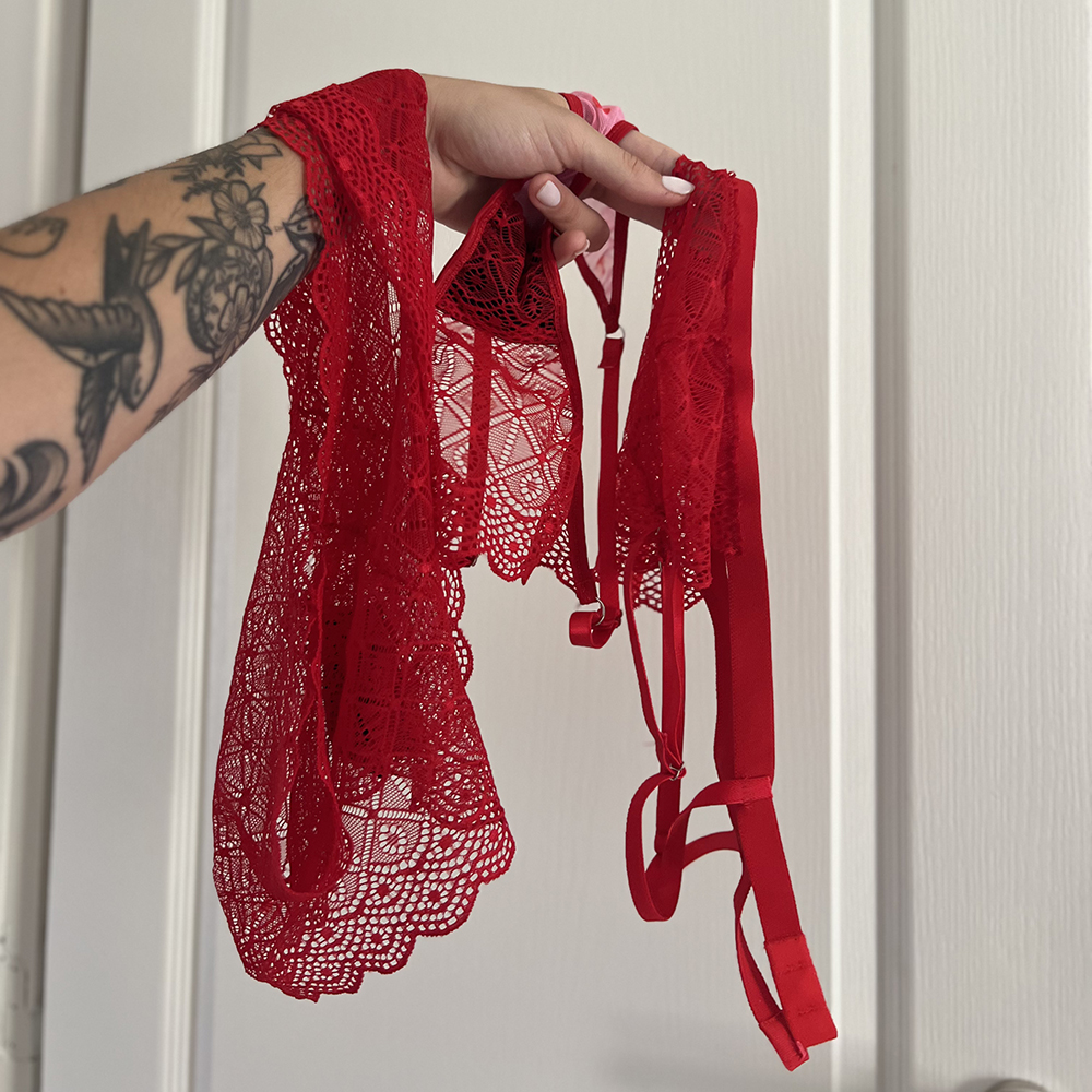 Es un conjunto compuesto por un bralette de puntilla con breteles regulables y una tangaless o culotte de puntilla. La tangaless posee reguladores y refuerzo de algodon. El culotte es la comodidad hecha prenda, no marca.