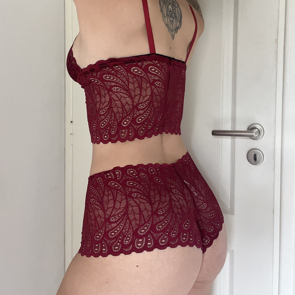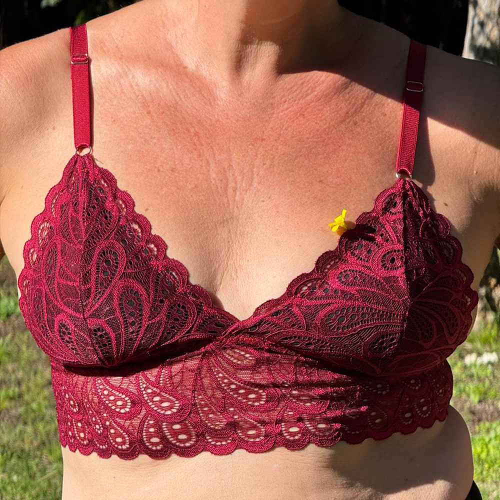 Aca vas a encontrar al corpiño Catalina junto con las bombachas tangaless y culotte realizados en este color bordo. Llevando este conjunto te regalamos una pulsera realizada con piedra natural agata roja para que te acompañe todos los dias.