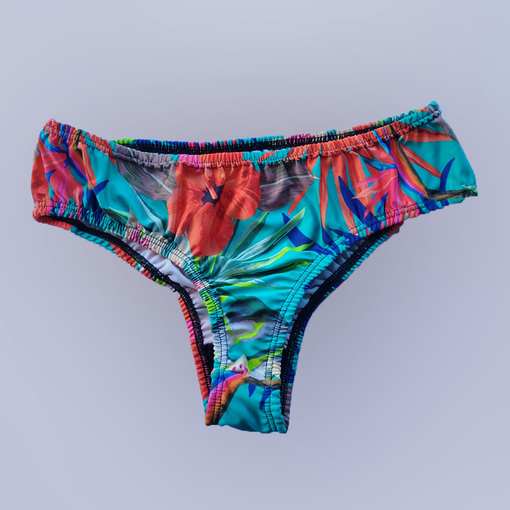 Bombacha tipo culotteless de Lycra estampada, con refuerzo de algodon en la entrepierna. El elastico esta embutido para evitar roces con la piel.