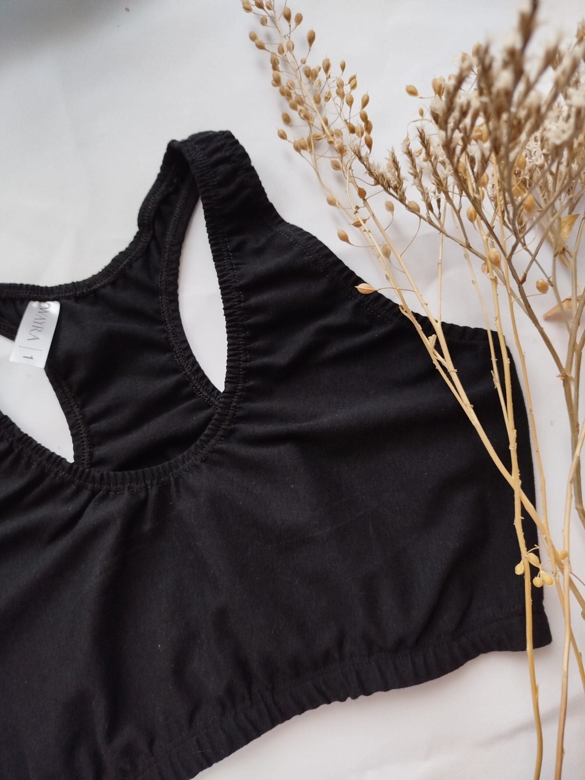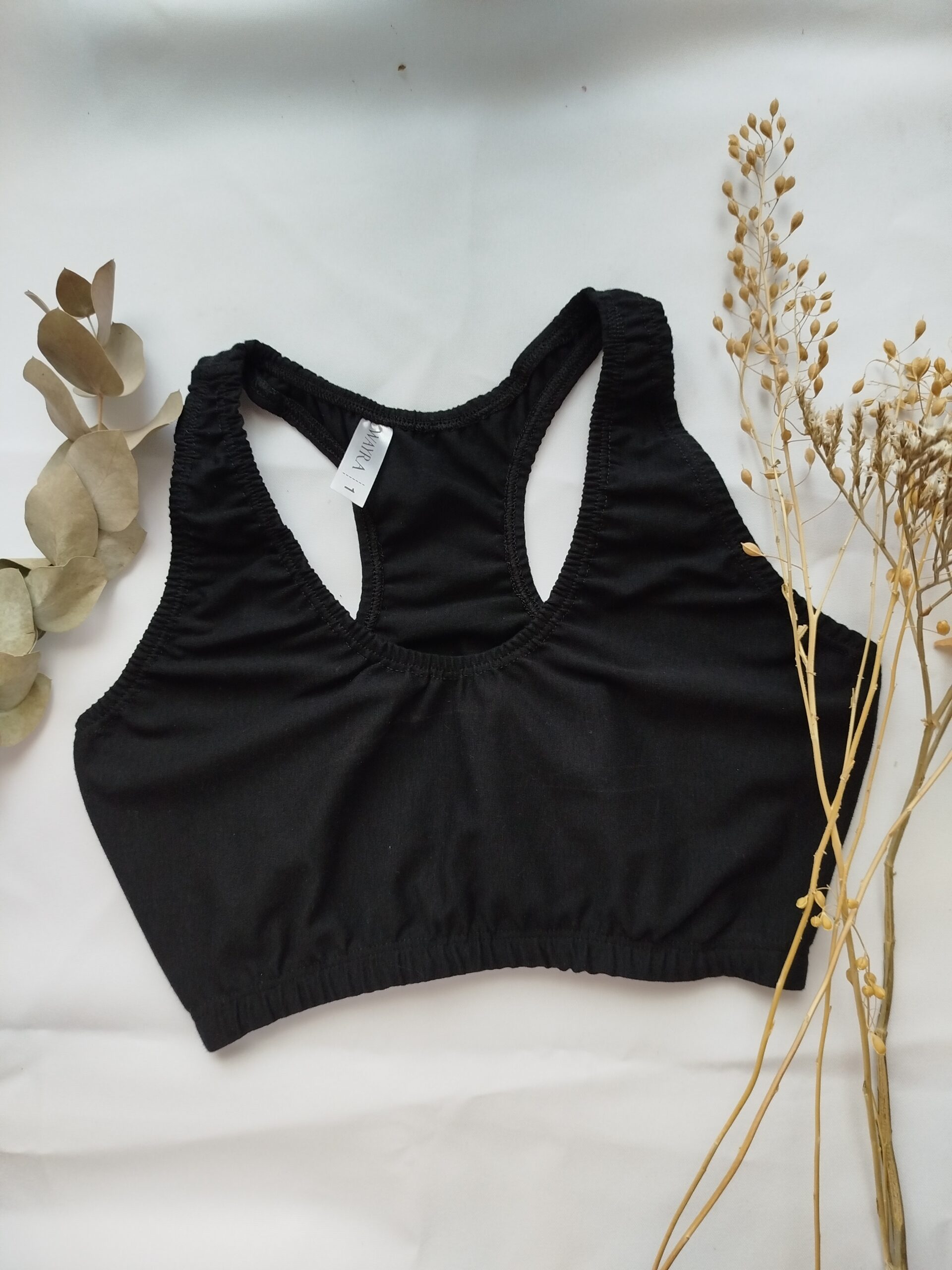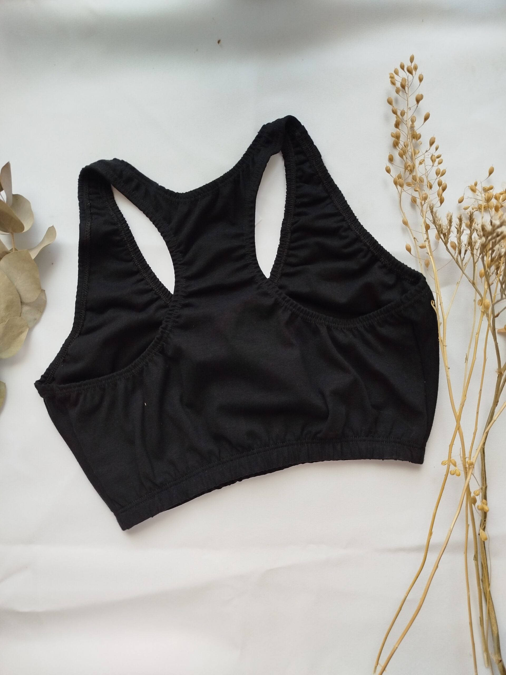 Corpiño tipo top con espalda deportiva, realizado en tela de algodón con elásticos embutidos para evitar el roce con la piel.