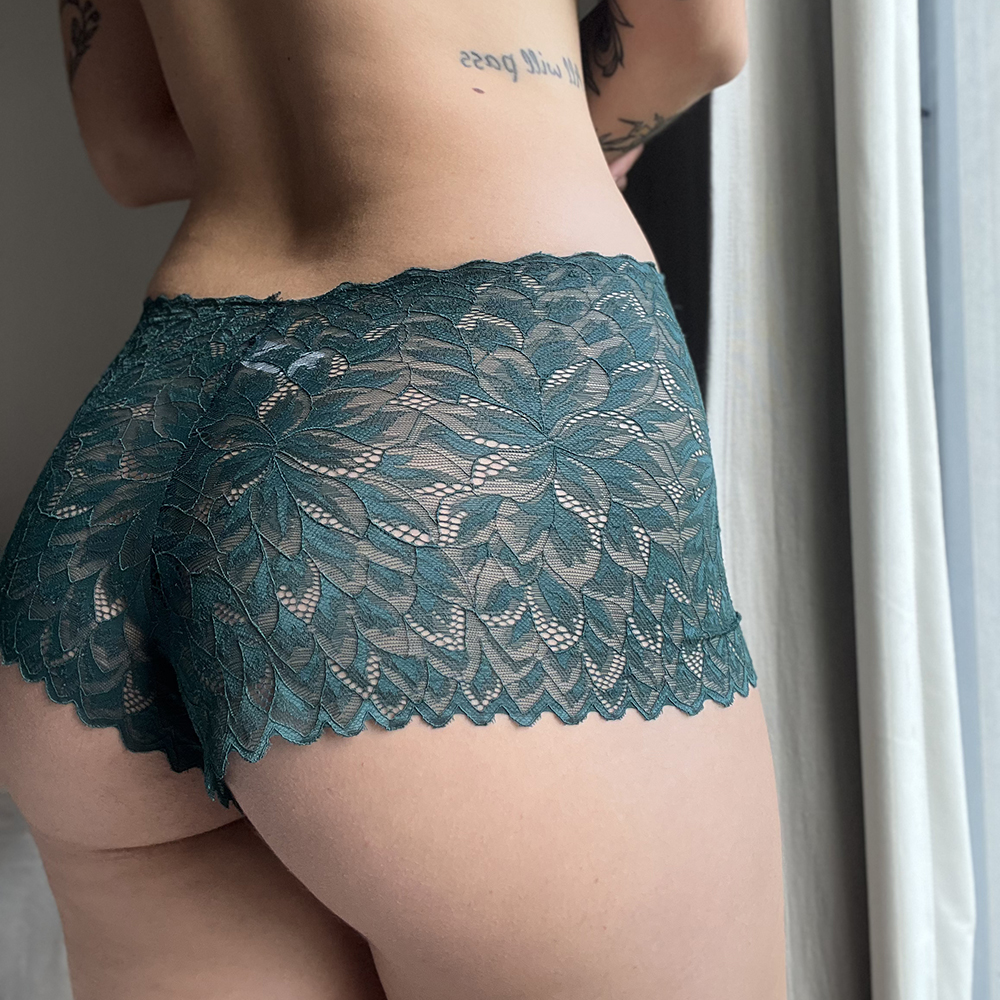 En este lugar vas a encontrar el corpiño Juliana, el corpiño Violeta, la tangaless y el culotte de puntilla de color verde para que puedas usar, combinar, cambiar.