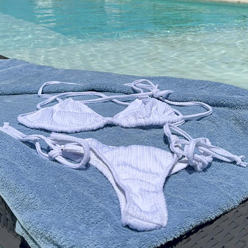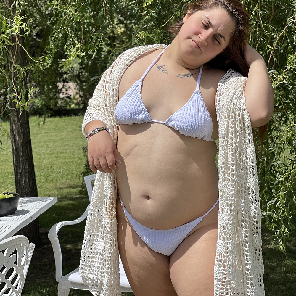 Bombacha tipo tangaless realizada en tela lycra con textura y filtro UV. Forrada en ambas partes. Posee cuatro tiras de la misma lycra para atar en los laterales, ajustando la prenda a tu medida.
