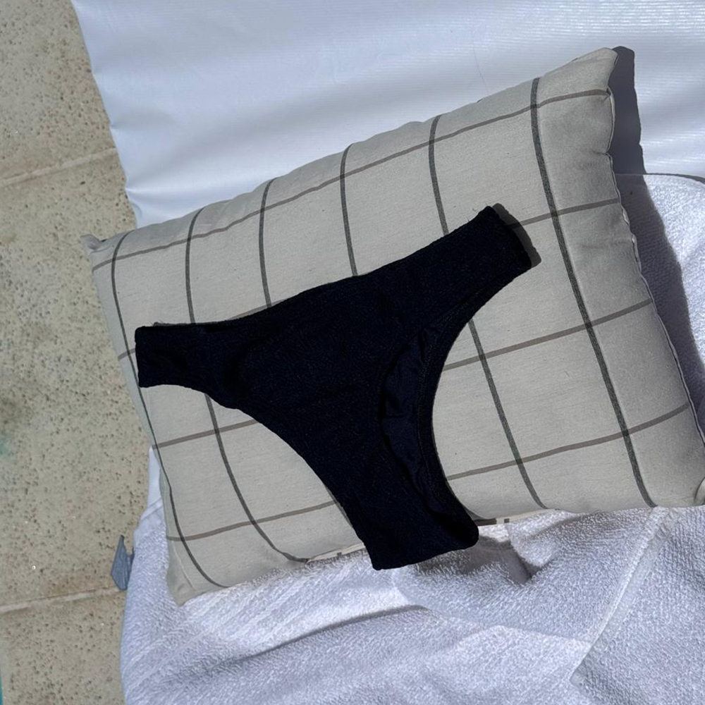 Bombacha tipo vedetina realizada en tela lycra con textura y filtro UV. Forrada en ambas partes, así la tela no se pega ni se marca la piel.